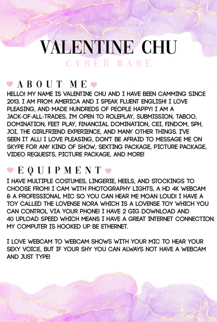 Hello! My name is Valentine Chu and I have been camming since 2013. I am from America and I speak fluent English!